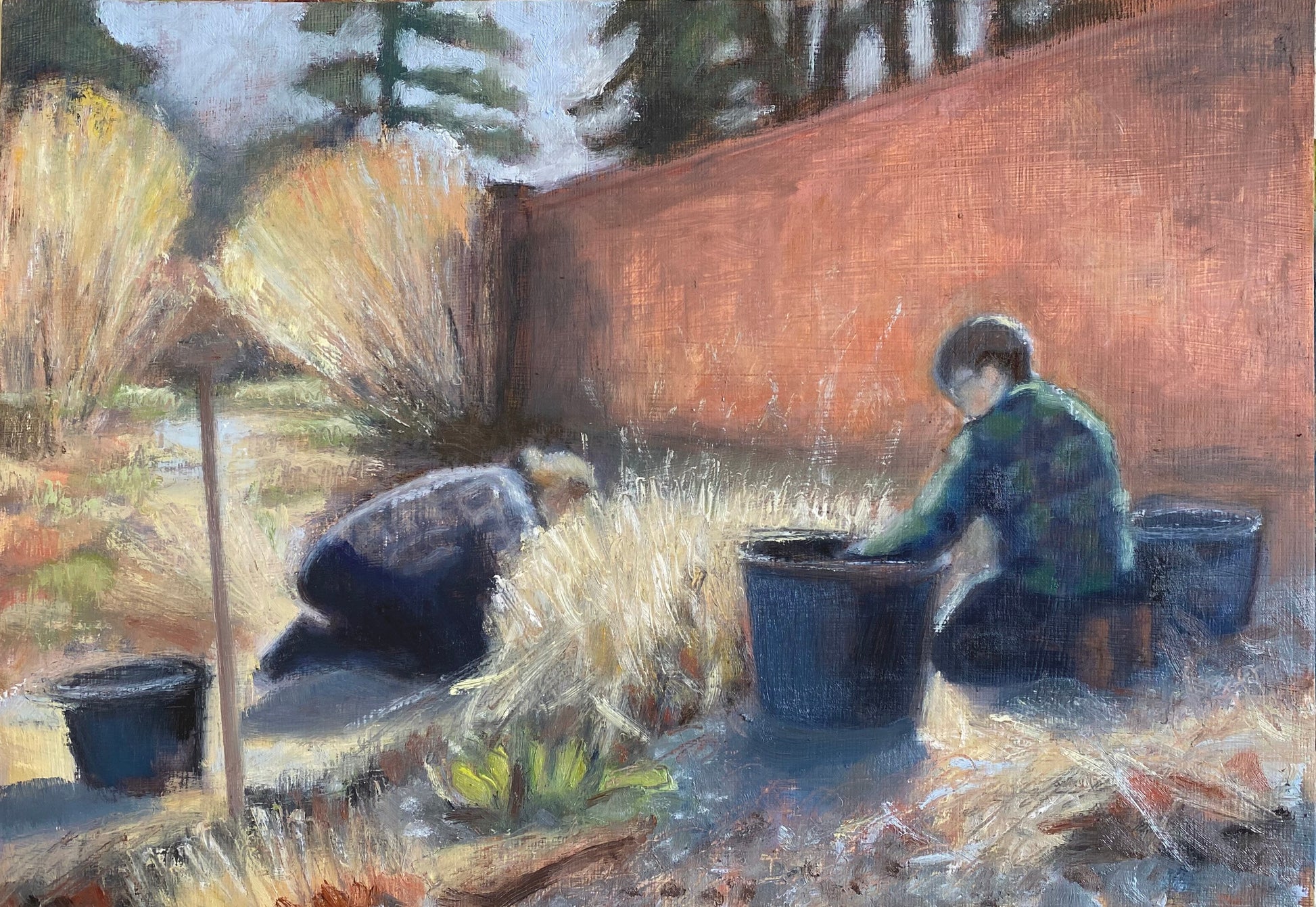 Laura and Dan, Wildegoose Nursery. From an original painting by Mary Elliott. I sat, watching and sketching as Laura and Dan worked in the walled garden, on a fine March morning.